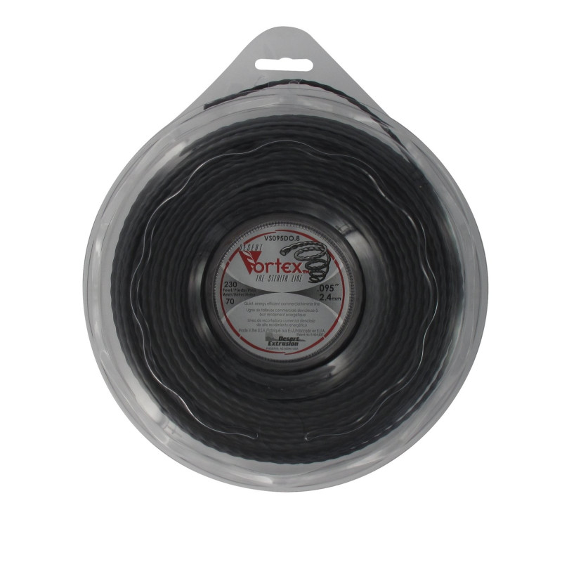 FIL NYLON TORSADE VORTEX - 2.4X70M - DONUT Le fil nylon hélicoïdal copolymère VORTEX fabriqué aux Etats-Unis est un fil de qualité professionnelle qui, grâce à son profil aérodynamisne permet une réduction du bruit et des vibrations lors de la coupe. Alliant performance maximale et durabilité extrême, la forme hélicoïdale de ce fil permet également une diminution de la consommation de carburant de votre débroussailleuse. Le fil nylon hélicoïdal copolymère VORTEX est parfaitement adapté aux coupes d'herbes, d'herbes épaisses et de végétation sur sol rocailleux Ce fil débroussailleuse s'adapte sur tous les équipements : tête fil, tête universelle, coupe-fil, coupe-bordure, débroussailleuse électrique avec ou sans fil, débroussailleuse à dos, débroussailleuse thermique et rotofil thermique.